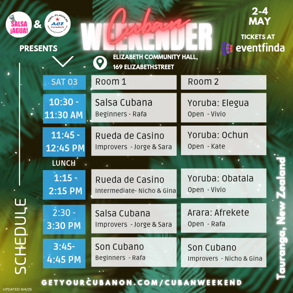What kind of classes are there? The classes cover Cuban salsa for soical dance and Rueda de Casino (Cuban salsa in a circle, executing the same moves togehter when called by a leader). These will be similar to the classes you would expeirence in your regualr school, but a range of instructors that are fun and amazing. Uniquely, there are an extenive range classes on the roots of salsa some dances that are from the african roots of dance in Cuba (the Bantu, Yourba and Arara). This festival also brings classes on dances that orignated in Cuba that are the roots from which Salsa developed from, the two most important are the Rumba and Son Cubano. The most extensive Cuban dance offering in one place and one time in New Zealand. The best place to explore and enjoy Cuban dance. Check out the timetable below